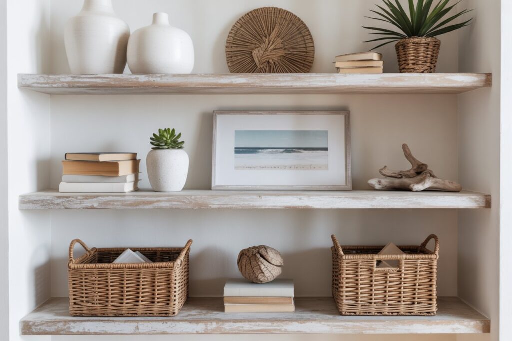 Style your coastal shelves in layers: a few books stacked horizontally, a ceramic vase, a trailing plant, a framed mini print, a woven basket. The goal is “artfully casual” — as if a very stylish person just happened to arrange things that way.