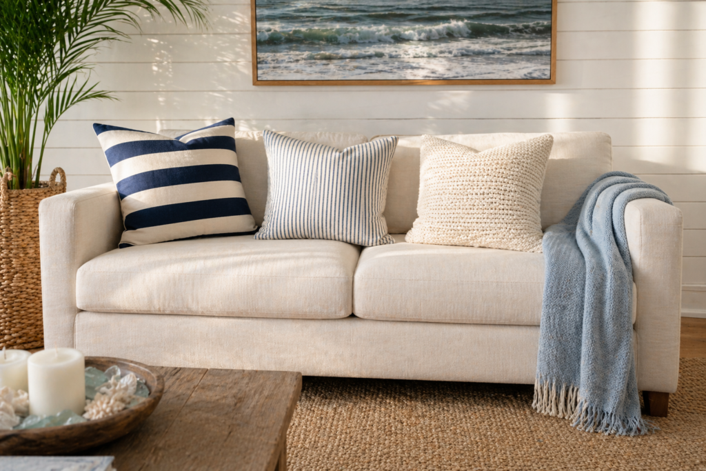 💡 Pro Tip: Style your coastal sofa with a mismatched collection of throw pillows in varying textures — chunky knit, woven cotton, embroidered linen — rather than a perfectly matched set. It looks far more authentic.
