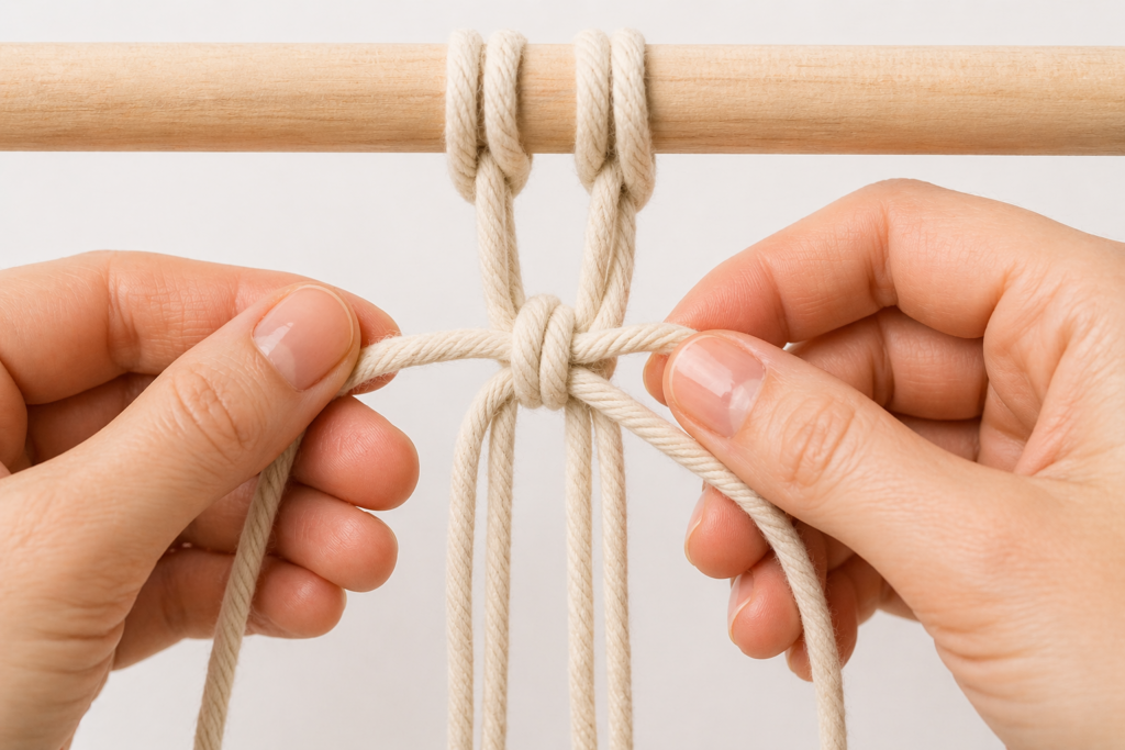 A 4mm or 5mm three-strand twisted cotton cord is ideal for beginners. It grips well, shows knot definition clearly, and is comfortable on your hands during long knotting sessions. Avoid synthetic or polyester cords as they are slippery and difficult to control.
