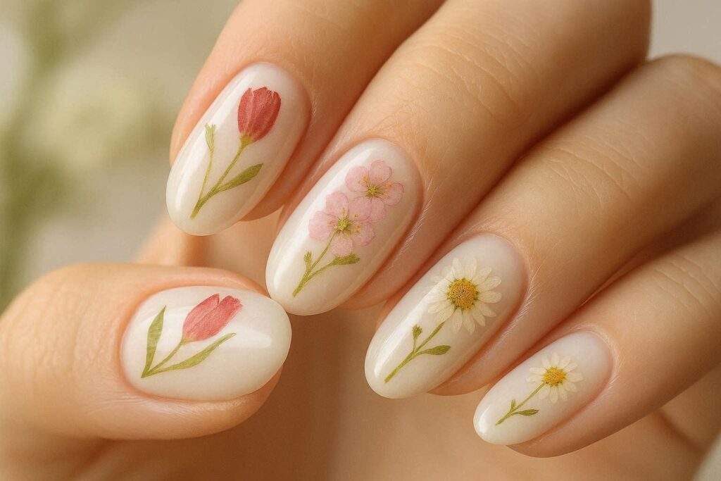 The pressed flower nail trend has exploded in 2026. Apply real or printed dried flowers over a clear gel base and seal with a gloss top coat. This creates a botanical, artistic take on Easter nail ideas that’s truly one-of-a-kind.