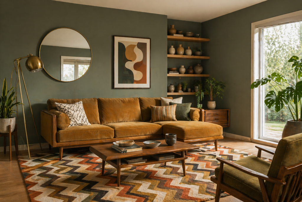 To create a mid-century forest vibe, start with pewter green walls and select furniture pieces that define the era. Look for low-profile sofas with tapered wooden legs in walnut or teak. Choose upholstery in neutral tones — warm grey, oatmeal, or dusty mustard — to complement the pewter green backdrop without overpowering it.