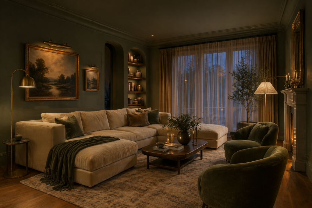 Pewter green is also highly sensitive to light. In bright natural daylight, it reads as a fresh, airy green with a slightly earthy character. As the day moves into evening and artificial lighting takes over, the color shifts toward a warmer, more enveloping tone that feels cozy and intimate. This quality makes it particularly well-suited to living rooms, which are used throughout the day and into the evening.