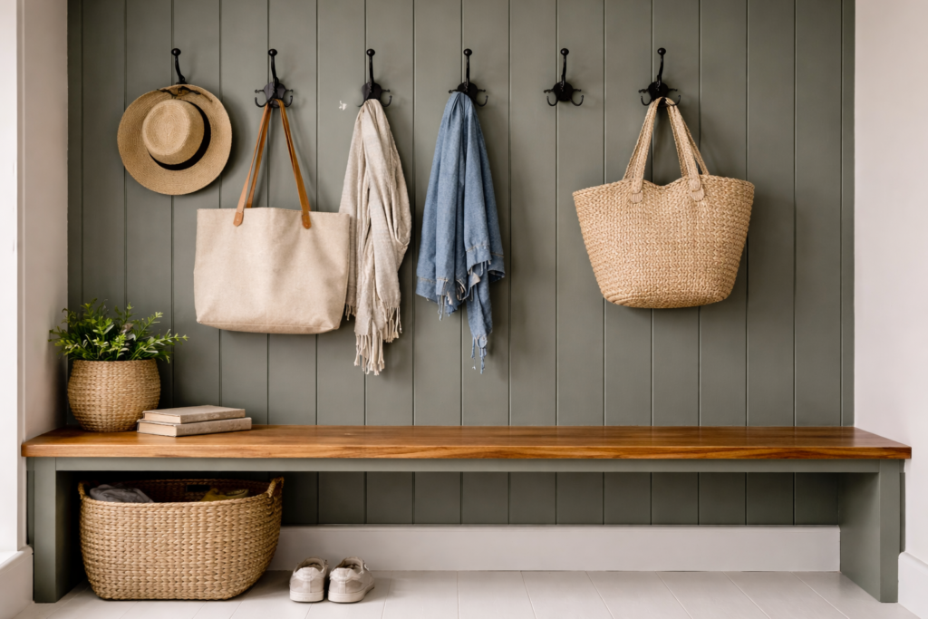 This is one of the most achievable pewter green mudroom ideas on this list. You do not need a major renovation. A coat of paint, some open shelving, and the right accessories will get you most of the way there.