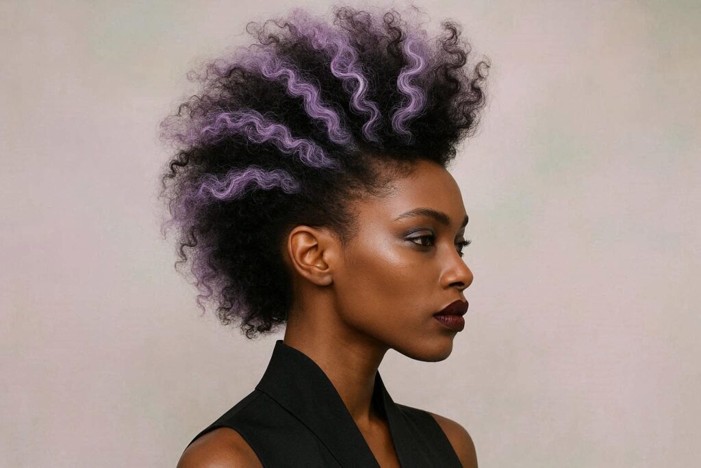 The fro hawk — a natural hair take on the mohawk where the sides are smoothed or braided down and the center section is left in its full curly or coily glory — gets a spring 2026 color upgrade with lavender highlights woven through the voluminous center section.