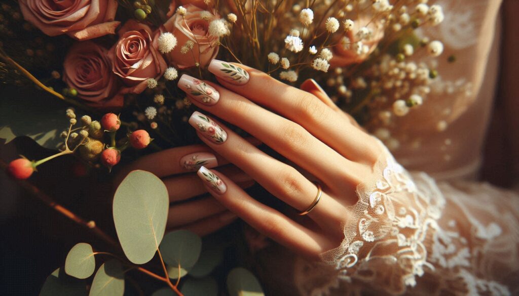 Hand-painted floral designs are perhaps the most quintessentially romantic of all wedding nail ideas. Tiny rosebuds, cherry blossoms, wildflowers, or eucalyptus sprigs painted onto a nude or white base create nails that look like miniature watercolor paintings. The most skilled nail artists can match your specific wedding flowers.